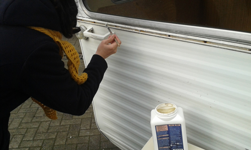 Im Außenbereich geht es unterdessen weiter mit den überlackierten Alu-Zierleisten. Der aufgepinselte Abbeizer muß hier sechs Stunden einwirken, bevor das ursprüngliche Aluminium wieder zum Vorschein kommt.